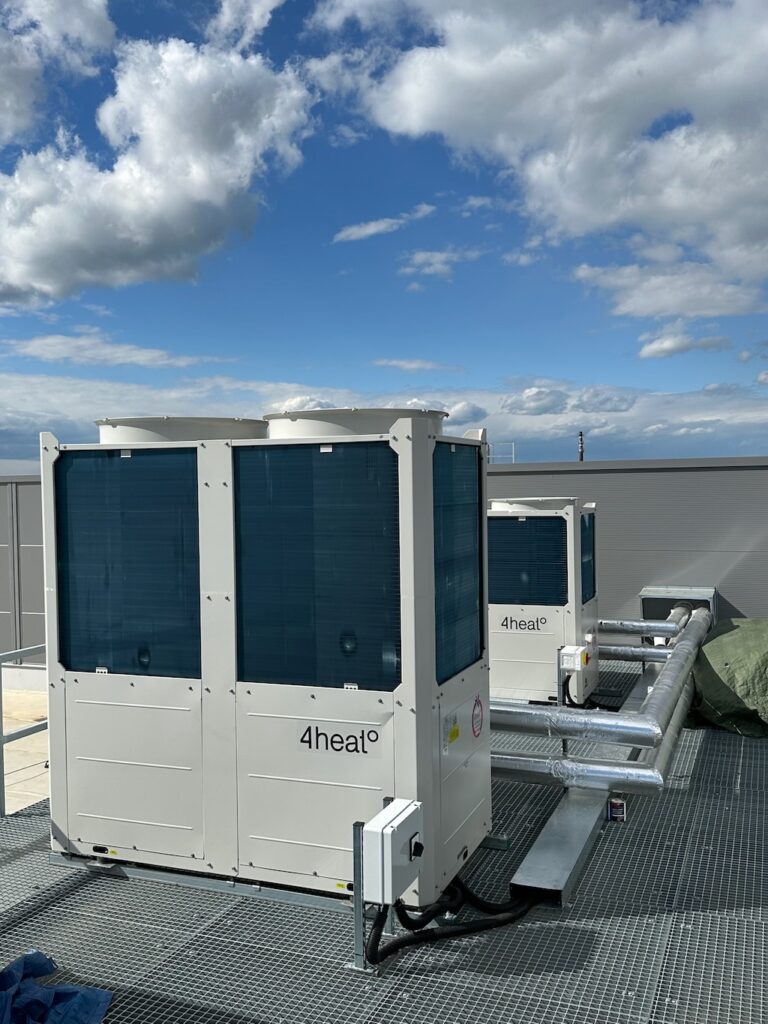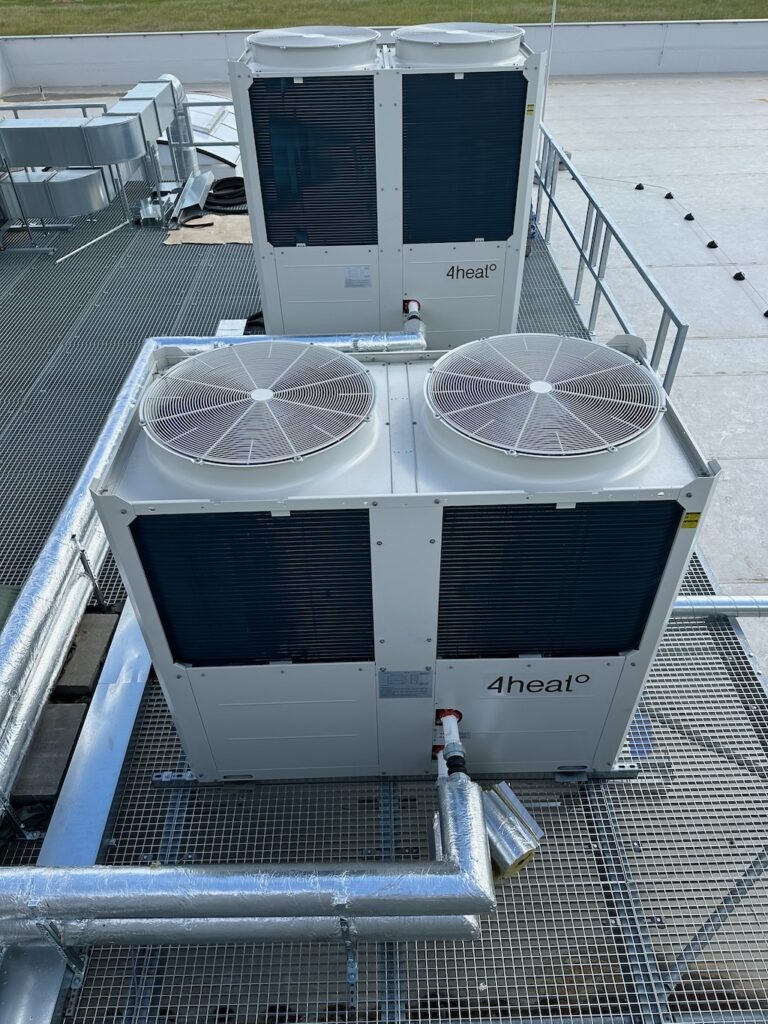 Zdrojovou energii dodávají dvě průmyslová modulární tepelná čerpadla s ekologickým chladivem R32, která poskytují výkon 160 kW vytápění a 150 kW chlazení (VRF jednotky). Součástí systému je i ohřev teplé užitkové vody pro každodenní potřebu zaměstnanců – od mytí rukou po sprchy.